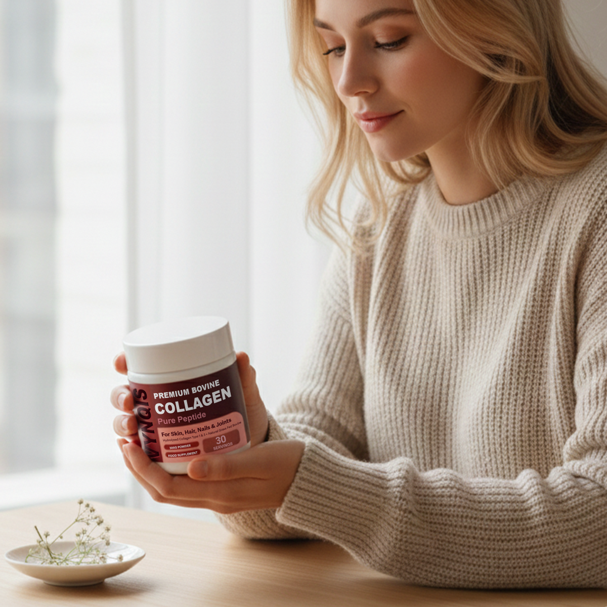 ✅ VYNQIS PREMIUM BOVINE COLLAGEN IS PURE HYDROLYSED PROTIEN PEPTIDES POWDER Collagen is a key protein produced in the body and found primarily in skin, bones, cartilage, tendons, and teeth. Collagen loss starts between the ages of 18 and 29, and after age 30, we lose 1-2% of our collagen consistently. Nutrabytes’ pure hydrolysed Bovine Collagen supplement with a serving of 10,000 mg may support the overall health of skin, hair, nails, tissues, bones and joints.